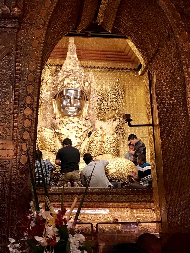 Elle attire l’attention par son immense bouddha vénéré par les birmans qui le recouvre chaque jour de feuille d’or. A tel point qu’il en devient méconnaissable ! seul sont visage est préservé et même nettoyé chaque matin à l’aube. A l’entrée de la pagode, vous trouverez plusieurs photos prises depuis 100 ans qui montent comment le bouddha a pris du poids sous l’effet de l’or …