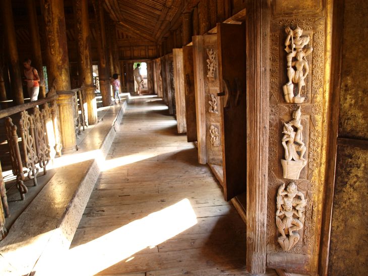 Le petit joyau qui a survécu à l’incendie de la 2ieme guerre mondiale est une des pièces de vie du roi Mindon que son fils héritier a fait déménager en dehors de la ville et qui est devenu depuis un monastère. Le monument est incroyable, tout en teck et incroyablement riche de sculptures.