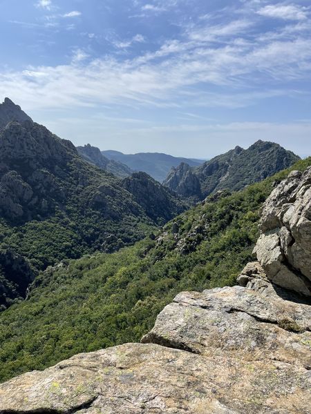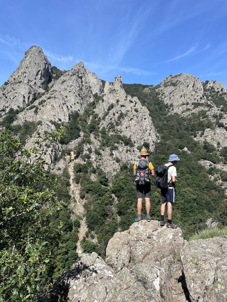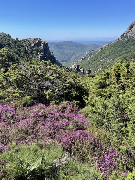 Descente sur le hameau de Bardou pour rejoindre Bau Filiti et son magnifique point de vue. Par les crêtes on surplombe les gorges d’Héric où se mêlent les aiguilles du