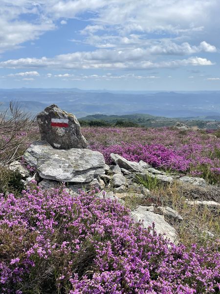 Départ pour le sommet du Caroux (1090m) où se mélangent tourbières, bruyères et genêts, site protégé par le parc naturel régional du Haut-Languedoc. Passage aux
